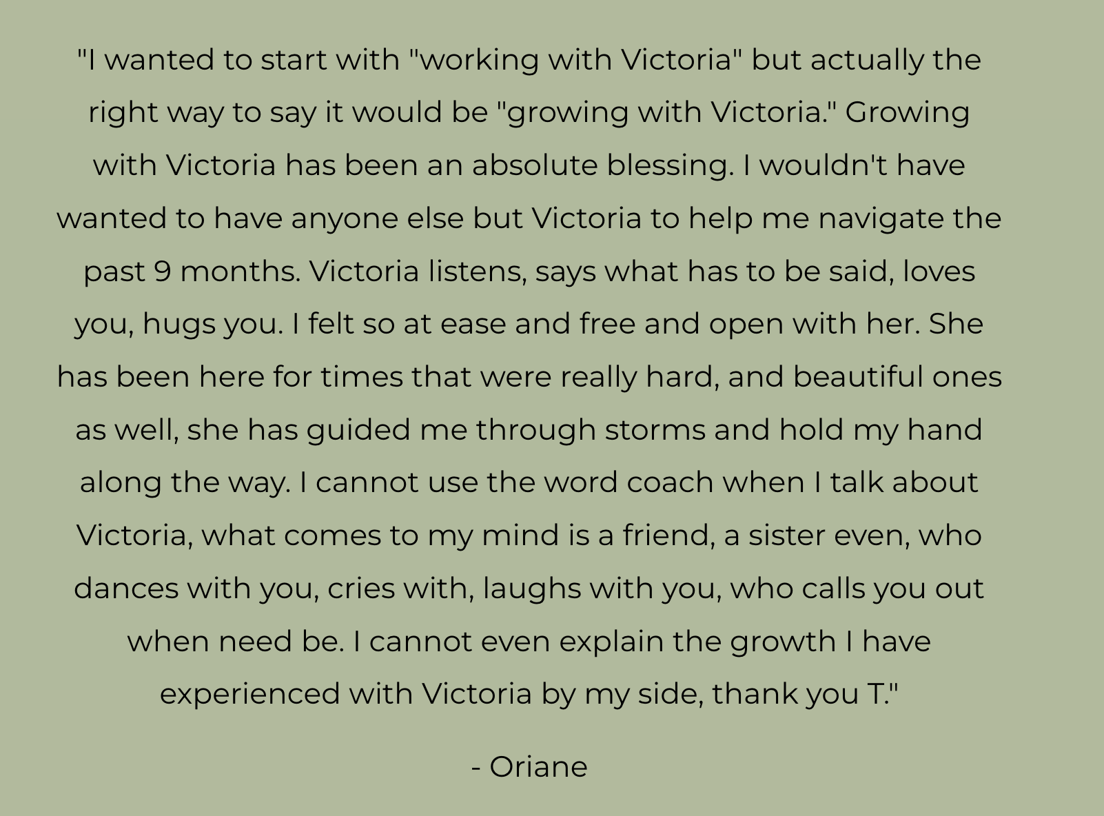 “Working with Victoria has been a deeply felt, truly transformative experience! She meets you exactly where you are, while gently and skillfully holding the vision of who you’re becoming. Her care for the human in front of her is profound. You can feel how much she genuinely sees and supports you, not just your goals. Paired with her creative vision and somatic attunement, she brings a rare ability to help your work come alive in a way that feels authentic and embodied.”